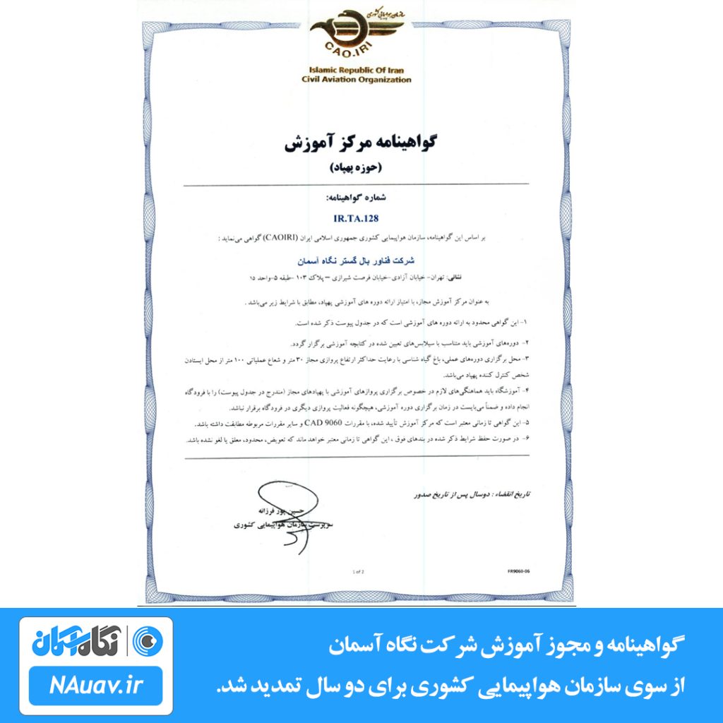 | نوع گواهینامه | دارای کارت خلبانی پهپاد صادر شده به صورت مستقیم از سازمان هواپیمایی کشوری درج نمرات در وب سایت شرکت نگاه آسمان با قابلیت استعلام آنلاین |